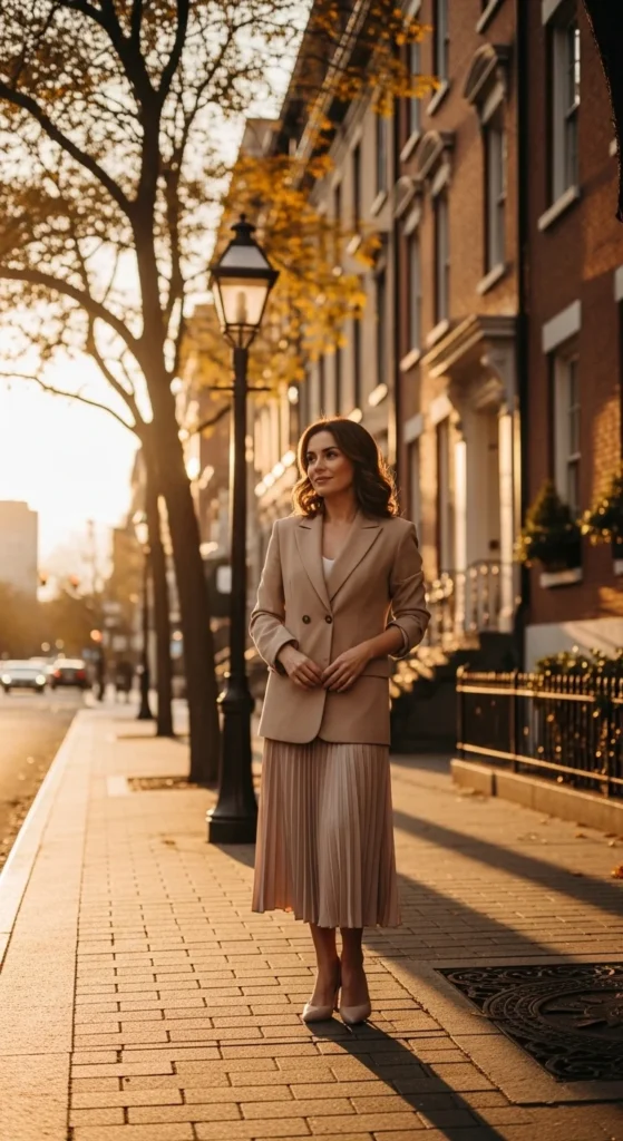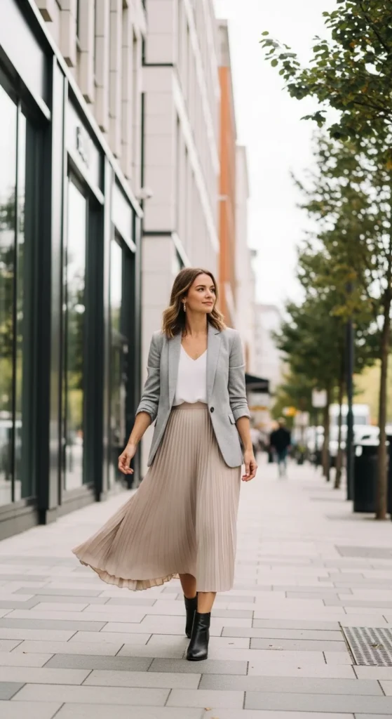 If you’re new to blazer-and-skirt outfits, a pleated midi skirt is the easiest place to start. The flowing movement of pleats softens the sharp lines of a blazer, creating a balanced and elegant silhouette.