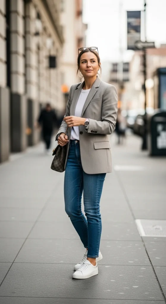 - Blazer + slim jeans + white sneakers