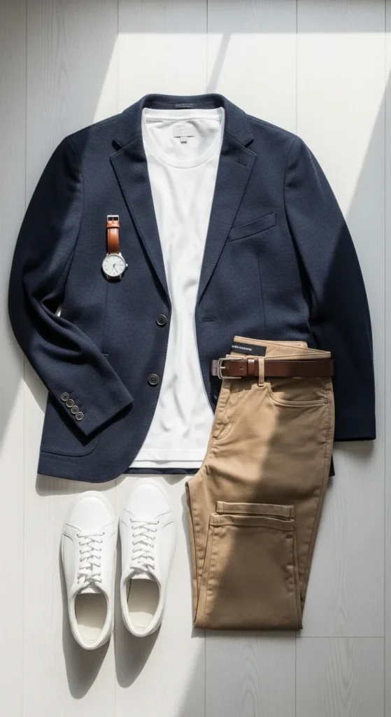 - Blazer + chinos + low-profile sneakers
