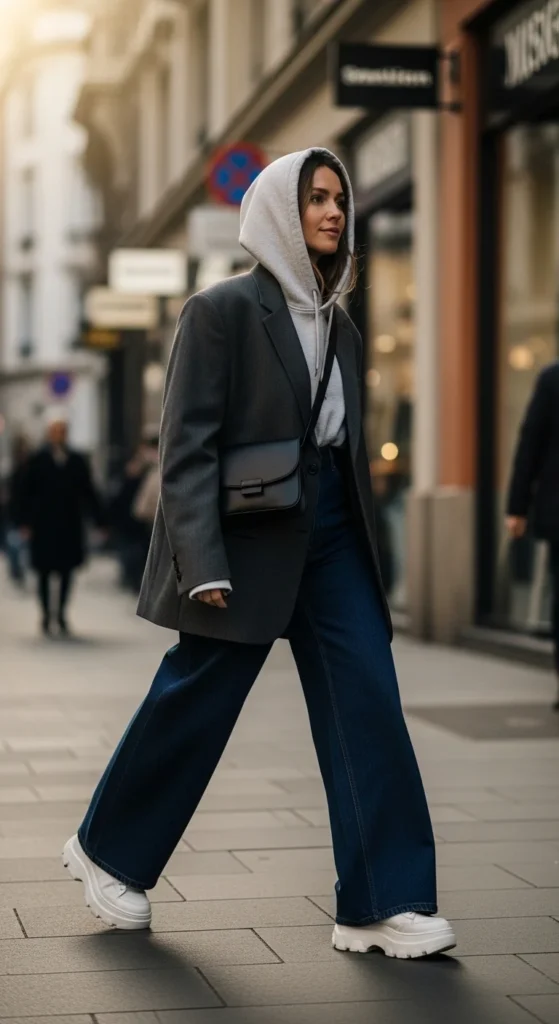 - Oversized blazer + hoodie + chunky sneakers