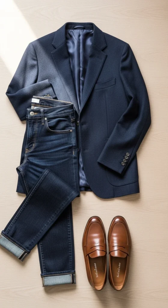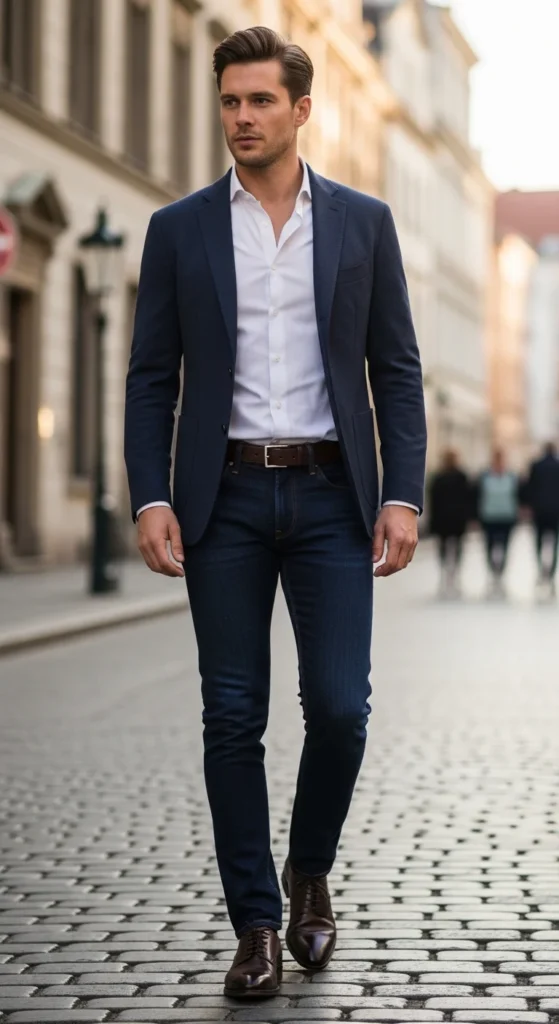 💡 Style insight: Navy remains the easiest pairing with dark indigo jeans because it keeps the outfit cohesive without looking like a suit.