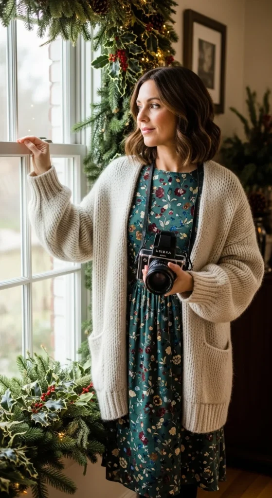 This is perfect for chilly mornings and looks great in photos. If you don’t have a sweater dress, an oversized sweater worn over thick leggings can create a similar effect. Add small gold or pearl accessories for a soft final touch.