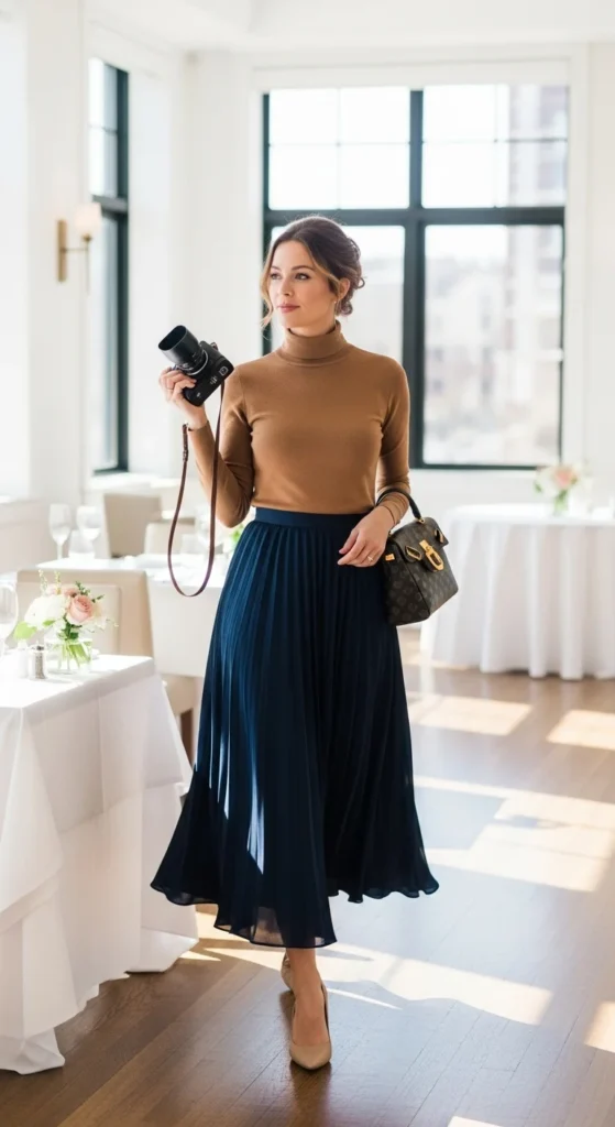 A fitted turtleneck keeps you warm while looking clean and elegant. Pair it with a flowing midi skirt for movement and comfort.