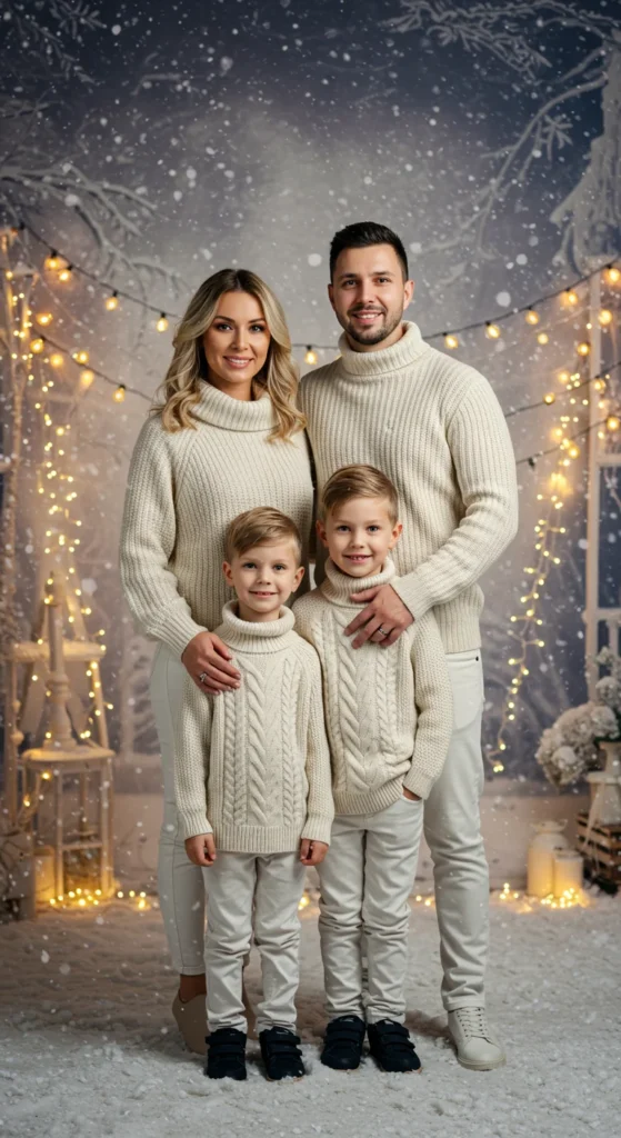 White outfits look clean and classic. Great for outdoor snowy photos or minimal indoor setups.
