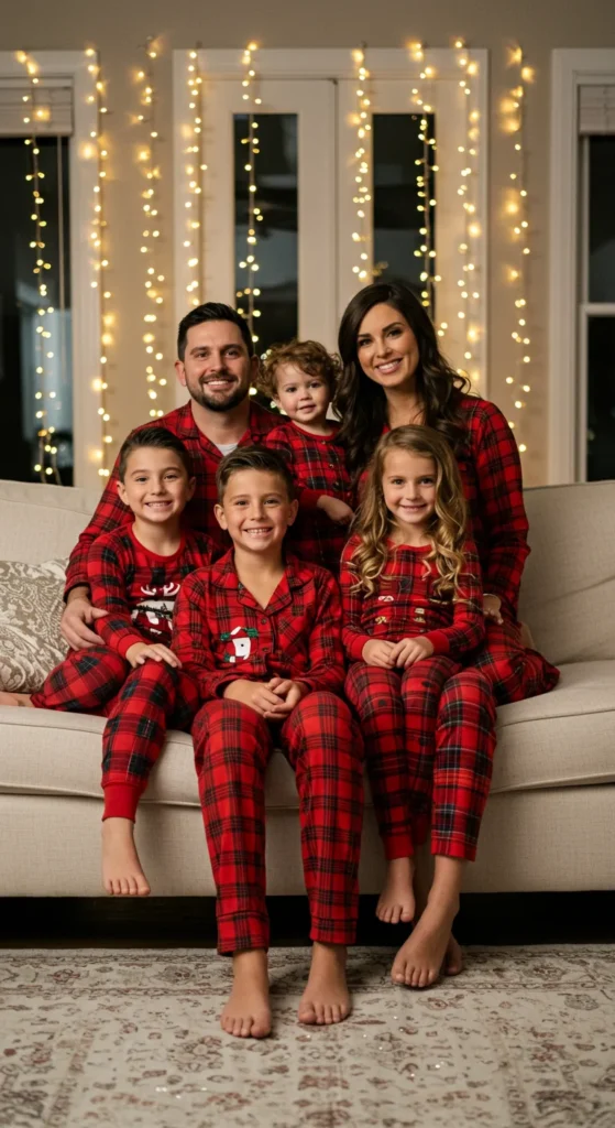 Classic plaid pajamas never go out of style, making them perfect for both casual lounging and holiday portraits.