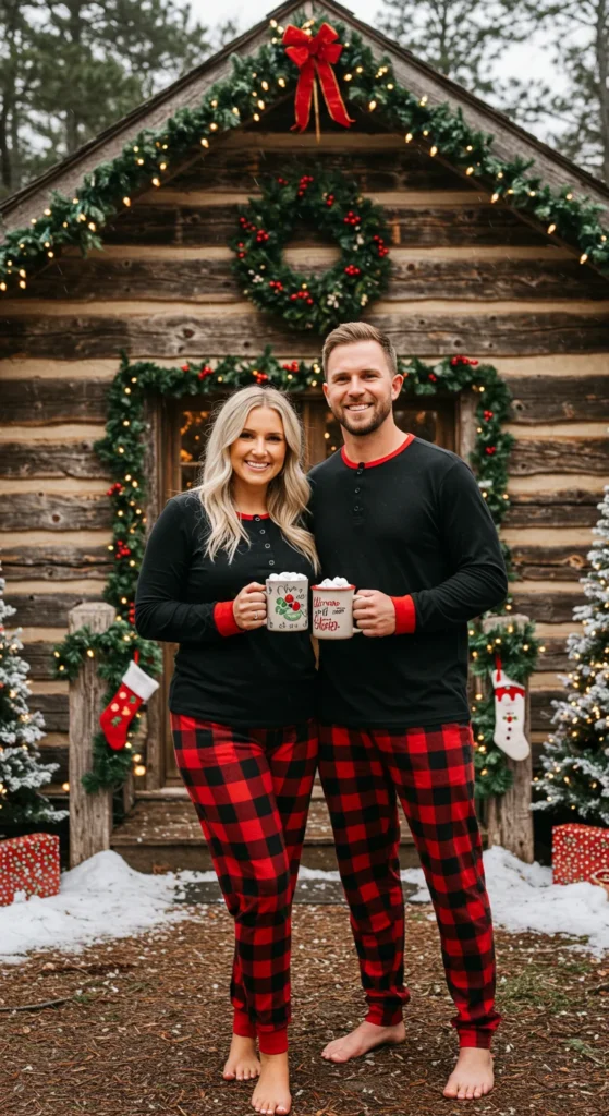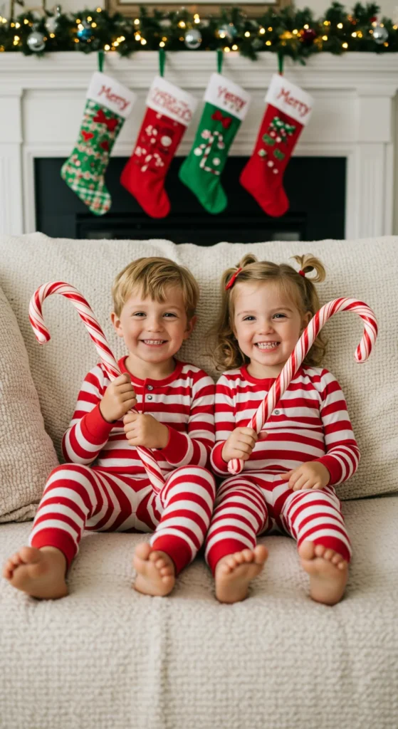 Holding candy canes as props during photos adds charm. Striped pajamas feel playful and instantly bring Christmas spirit to the room.