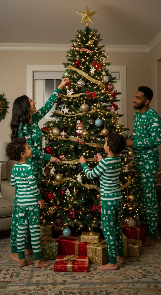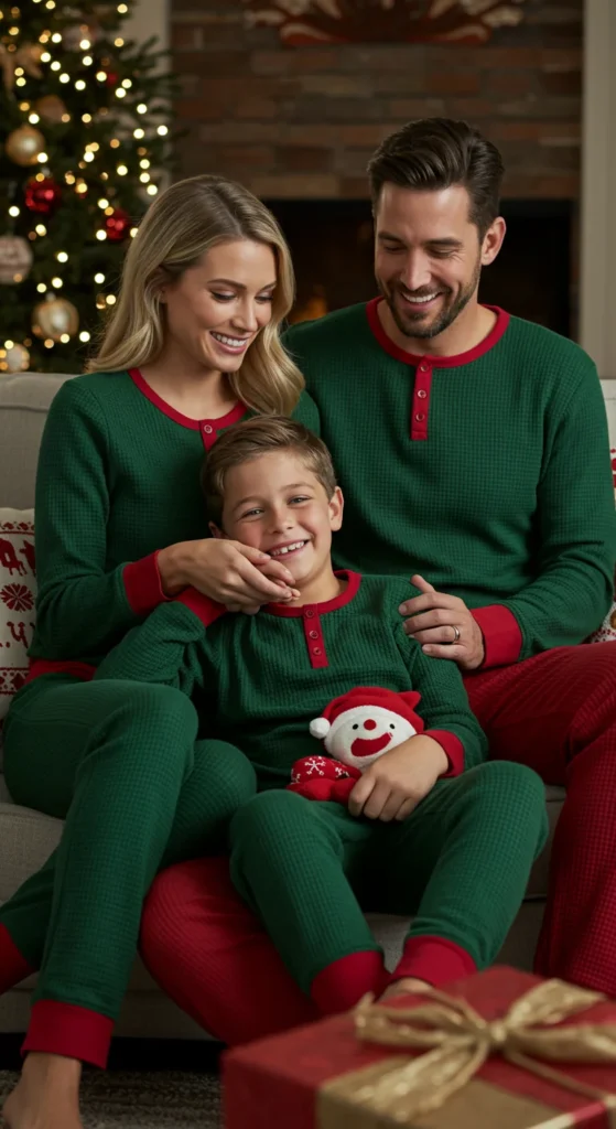 Grinch pajamas bring humor to family photos, keeping the mood lighthearted and festive.