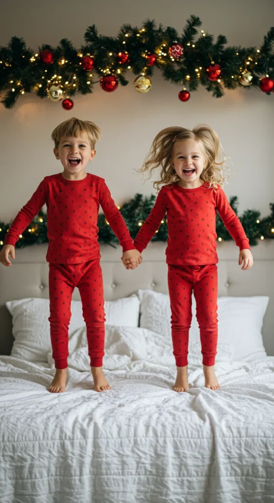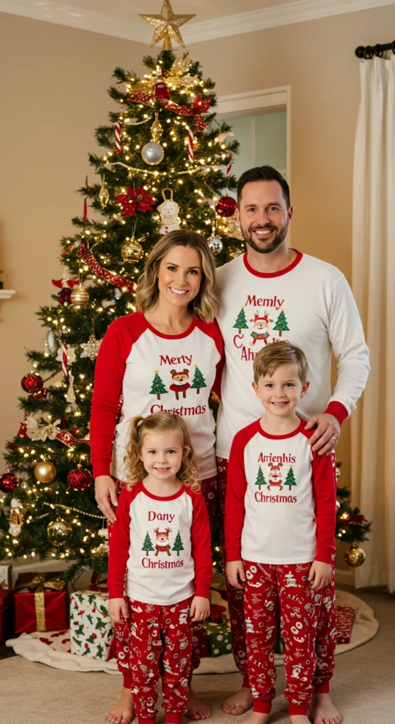 Plain red or white pajama tops make the best base. Add striped or plaid pants for balance. Kids especially love pajamas with their names, making photos more meaningful.