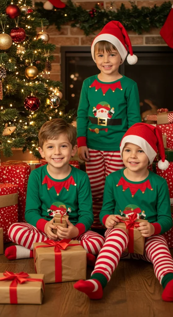 Elf pajamas bring playful charm. Sets often come with striped pants and green tops styled like elf uniforms.