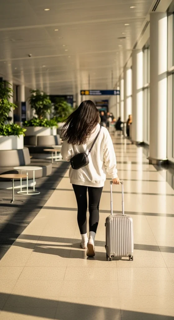 The soft fabric allows you to sit for long hours without discomfort. Add a long coat or padded jacket on top if it’s cold. Finish with clean sneakers or slip-on shoes for quick security checks.