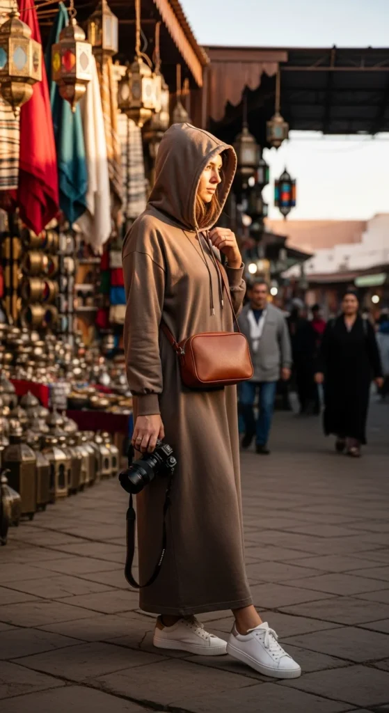 A hoodie dress gives both warmth and ease in a single piece. Pair it with sneakers for walking comfort.