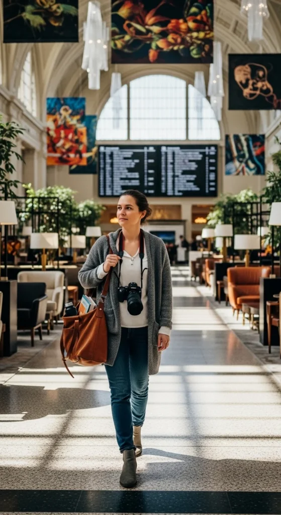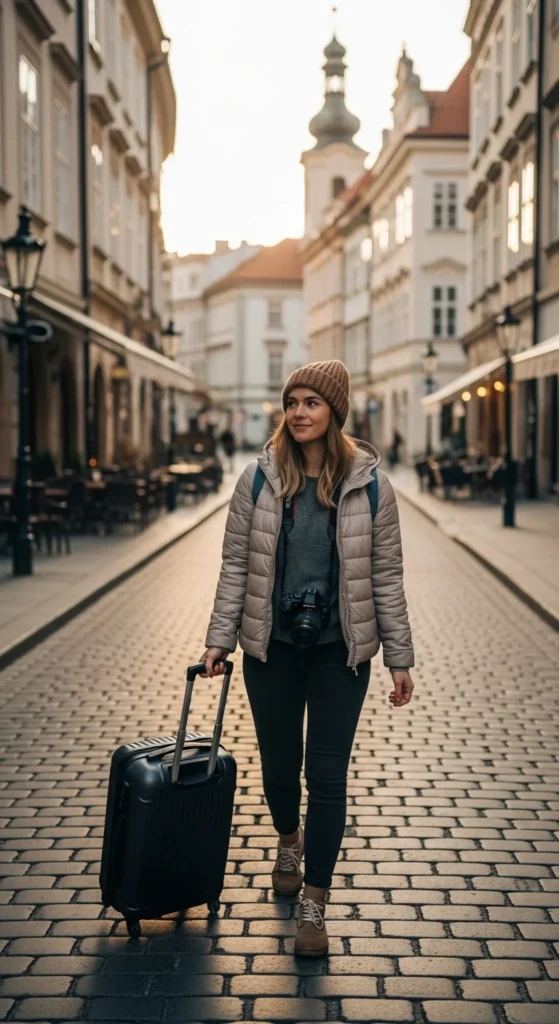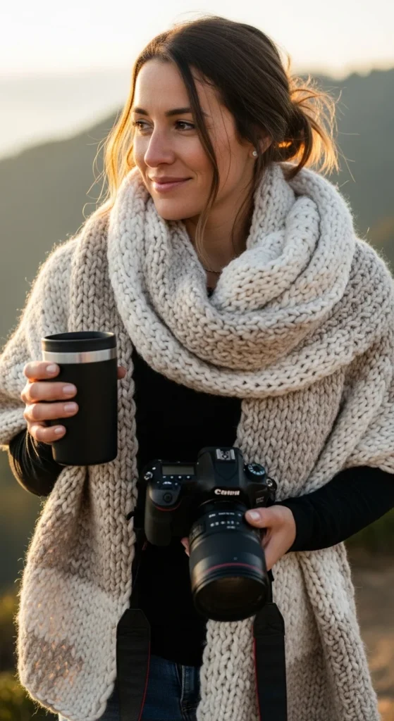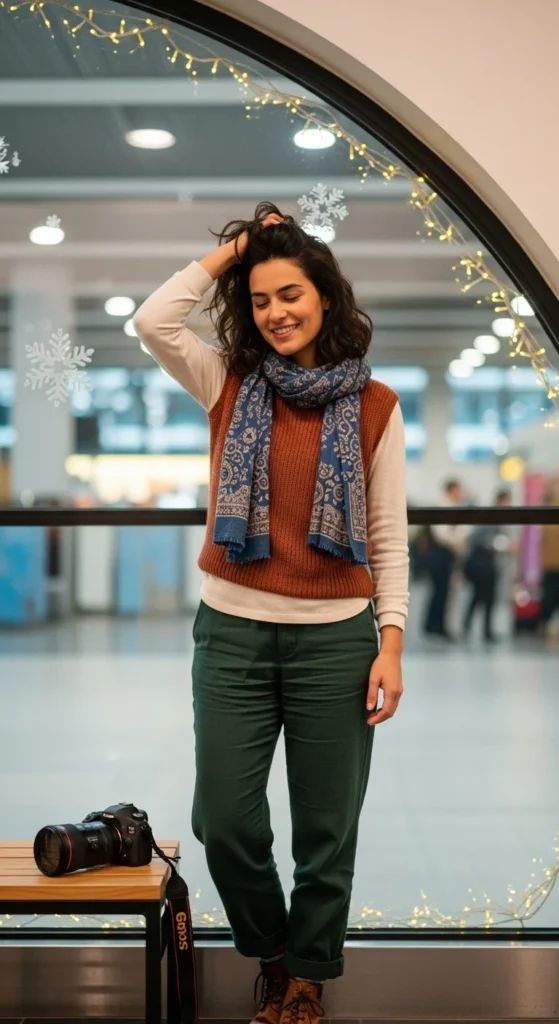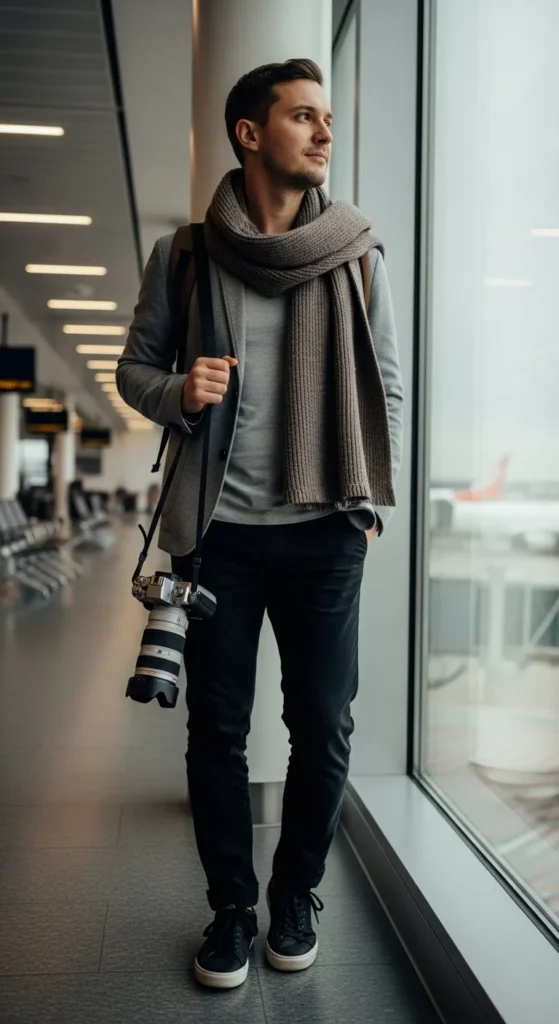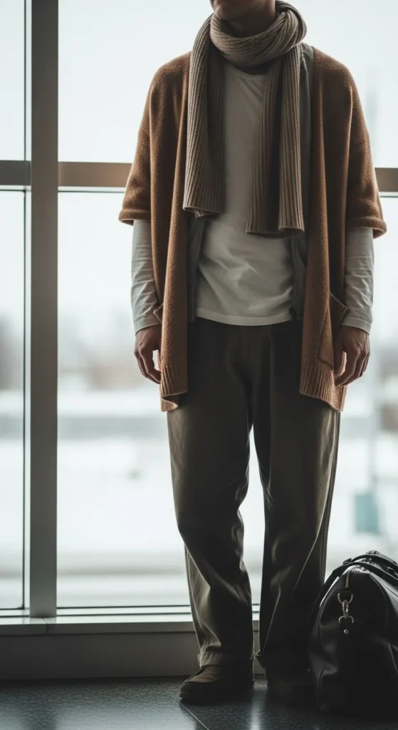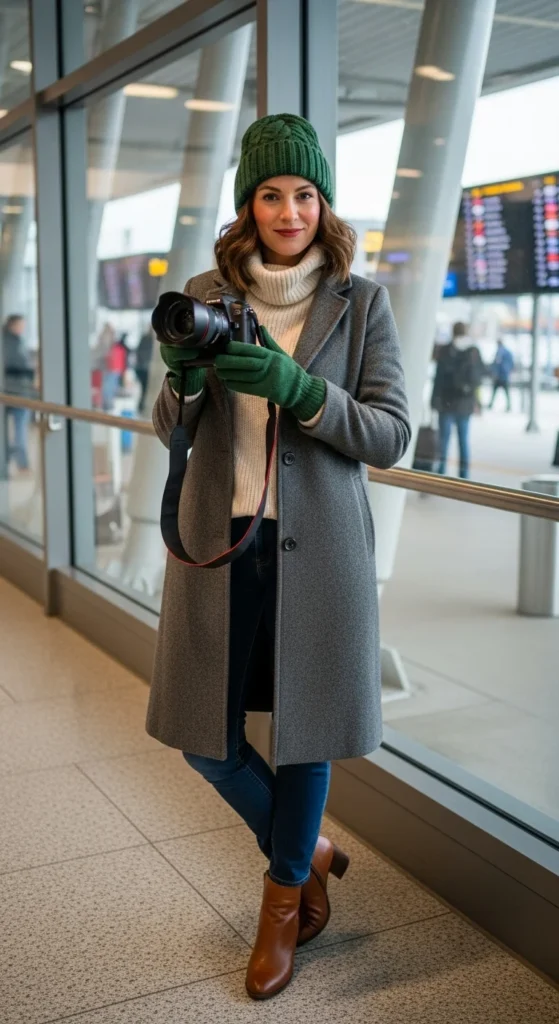 Add a soft scarf for extra warmth and style. This is one of the most practical ways to dress for changing temperatures when traveling during winter.