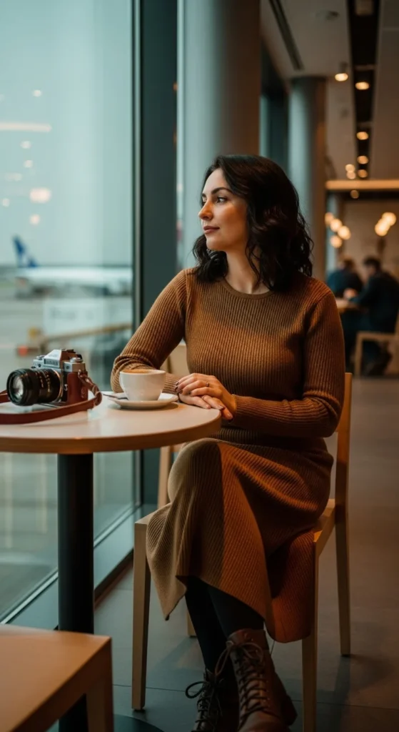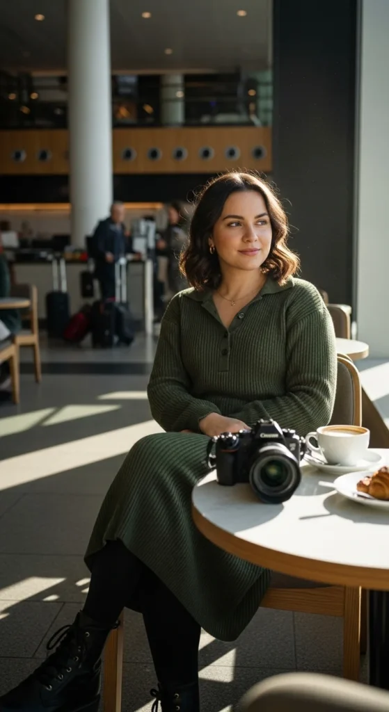 Add ankle boots for support while walking through terminals or stations. If the sweater dress feels loose, a small belt can add shape.