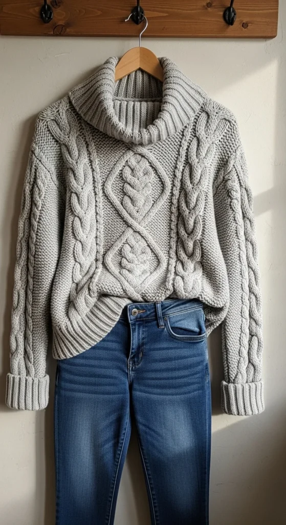 Cable-knit sweaters add character with raised patterns. Pair one with dark skinny jeans for a balanced shape. This keeps the attention on the sweater’s design. Add ankle boots or loafers. A small crossbody bag works well for daily wear. If the sweater feels too bulky, fold the front slightly. For a budget tip, try pairing old jeans by cuffing the hem to refresh the look. Add a scarf if temperatures drop. Keep jewelry minimal because the cable texture already draws attention. This outfit suits travel days, grocery runs, or casual coffee plans. Stick to muted colors like cream, charcoal, or forest green for a calm feel.