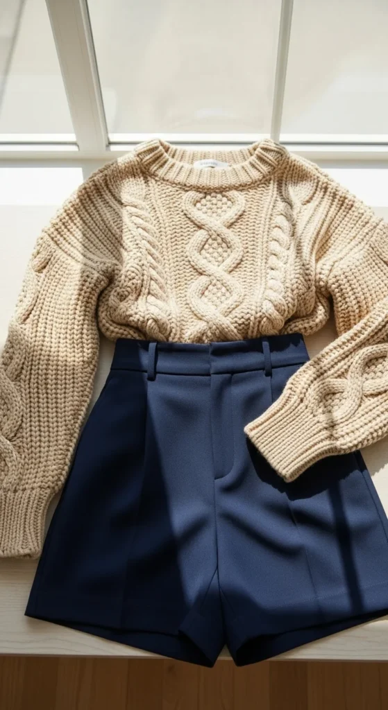 Shorts with chunky knits create a playful mix for mild seasons. Pick tailored shorts you already own in neutral colors. Balance them with a sweater that sits at the hips. Add loafers or boots. If it’s cooler, wear sheer tights underneath. A small shoulder bag fits nicely. DIY idea: cuff the shorts to adjust the length. Keep the sweater textured so the outfit looks intentional. This works well for transitional seasons or relaxed outings. Stick to soft colors like cream, tan, or gray.