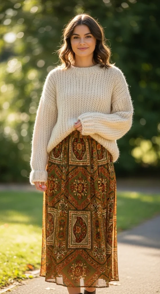 Printed skirts pair well with chunky sweaters because the knit softens bold patterns. Wear any skirt you already have—floral, geometric, or abstract. Pick a sweater in a neutral tone that complements the print. Add boots or flats. For budget friendliness, repurpose older skirts by pairing them with textured knits. If the skirt feels busy, keep accessories quiet. A crossbody bag works well. Fold your sleeves for a relaxed touch. This pairing works for lunches, casual events, or everyday wear.