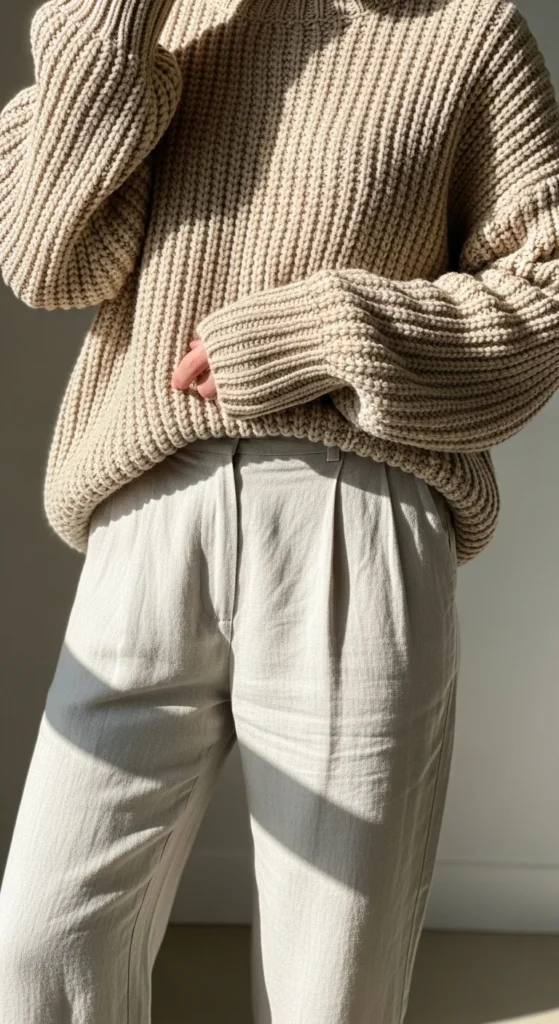 Linen pants add softness to chunky knits. Pick wide-leg or straight linen trousers. Keep the sweater loose to maintain balance. Add sandals or sneakers. This outfit works well for mild weather or indoor days. A long necklace adds interest. DIY tip: iron linen lightly or hang it near steam to relax wrinkles. Choose soft colors to match the sweater. Carry a simple tote. This combination feels airy while still warm.