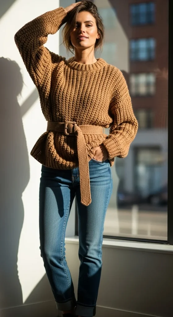 Belting a chunky sweater shapes your waist without giving up comfort. Use a belt you already have—thin or medium width works best. Pair with jeans in a shade you wear often. Add boots or simple flats. This creates a pulled-together look for errands or casual meetings. If the sweater feels too thick, tie the belt loosely. Add a structured bag for balance. A DIY trick: use a scarf instead of a belt for a softer effect. Keep colors calm so the belt stands out slightly.