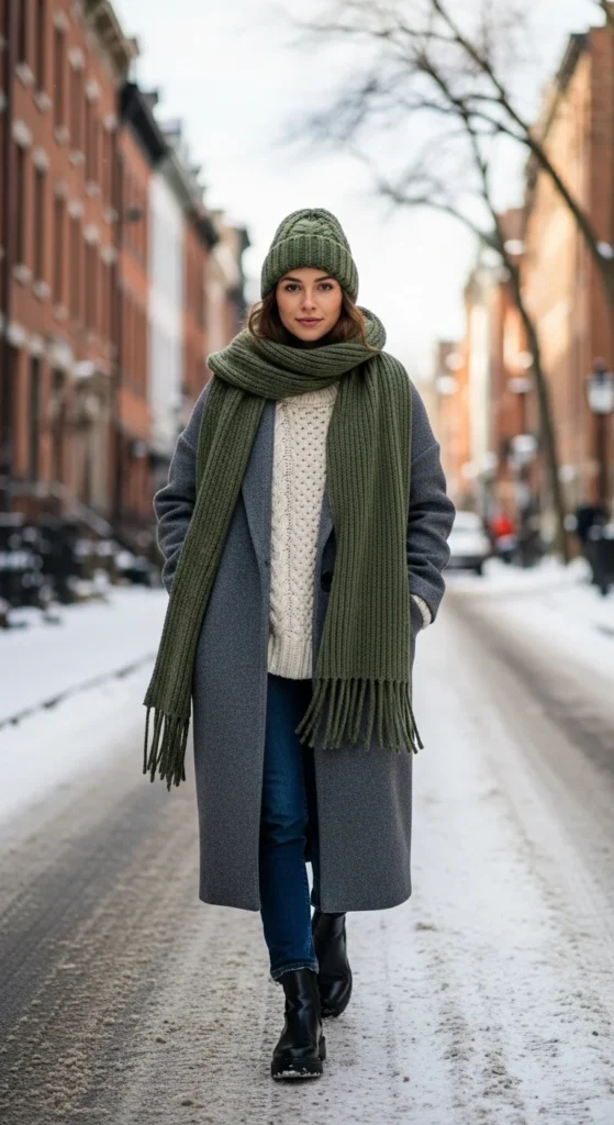 Layering a chunky knit under a long coat adds warmth and style. Choose a coat you already own—camel, black, or gray works well. Keep the sweater slightly loose so it doesn’t feel tight under the coat. Pair with jeans, trousers, or skirts. Add boots for a winter-ready finish. A small scarf works if the weather is colder. DIY idea: use coat clips inside the coat to keep it closed without buttoning. Keep accessories minimal so the layers stay the focus.