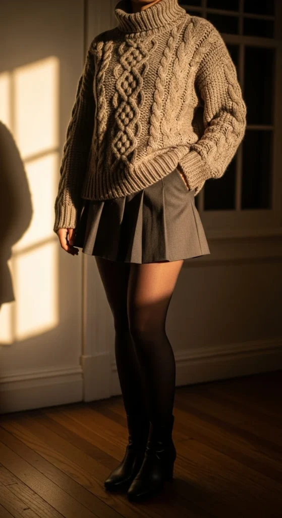 A mini skirt balances the volume of a chunky sweater. Add tights for warmth and structure. Pick a skirt in wool, denim, or faux leather. Pair with ankle or knee-high boots. A shoulder bag works well. If the sweater runs long, tuck it slightly or fold the hem under. DIY tip: add a brooch for a small detail. This outfit works for casual outings or daytime events. Keep the palette simple to match the cozy feel.