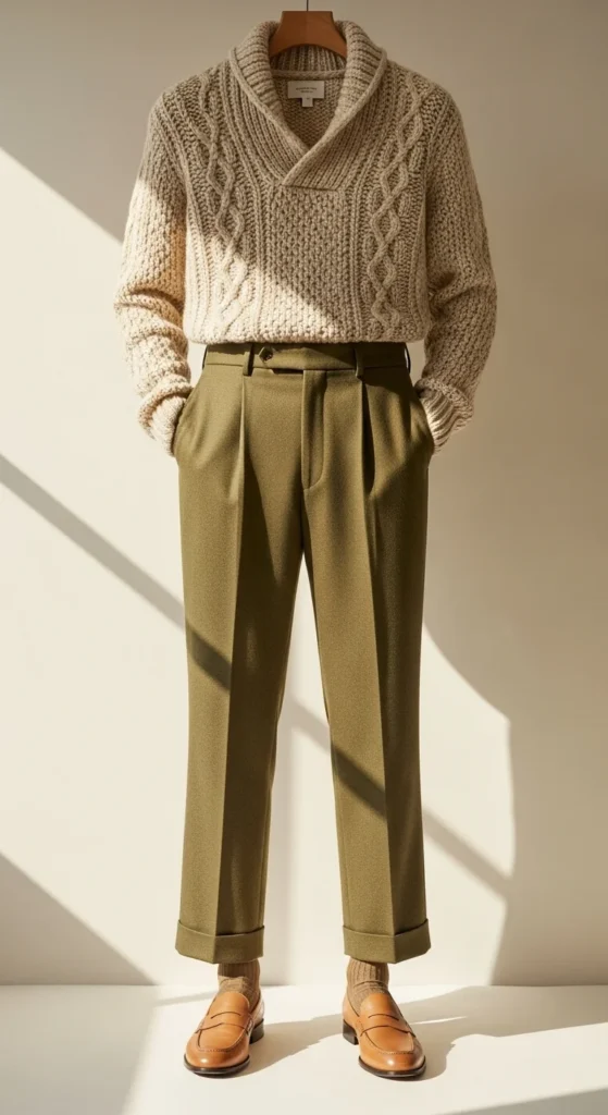 Straight trousers offer a clean shape that pairs well with chunky sweaters. Choose trousers you already own. Keep the sweater relaxed. Add loafers for a smooth finish. A structured bag adds interest. DIY idea: iron trousers lightly to keep lines sharp. Stick to soft colors like beige, gray, or brown. This outfit works for offices, casual gatherings, or daily wear.