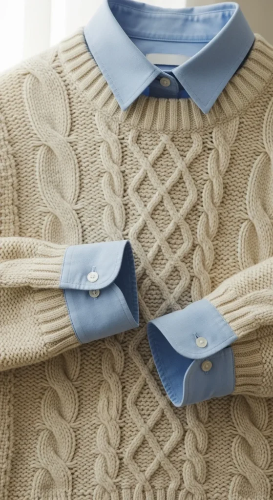 Layering a sweater over a button-down adds contrast and detail. Pick a shirt you already own—white or light blue works best. Let the cuffs peek out. Add jeans or trousers. A small bag completes the look. If the shirt feels bulky, choose a thinner cotton style. DIY tip: iron the collar so it stands neatly. This pairing works for casual office days or everyday wear.