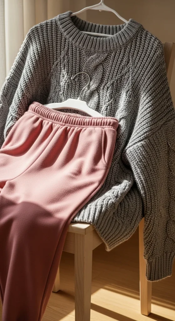 Joggers turn chunky knits into a relaxed, cozy outfit. Pick joggers in neutral colors you already have. Add sneakers or slippers. A crossbody bag or tote works for errands. Keep accessories minimal. DIY idea: fold jogger cuffs to shorten the length. This outfit works well for travel days, lounging, or quick walks. Keep the color palette calm.