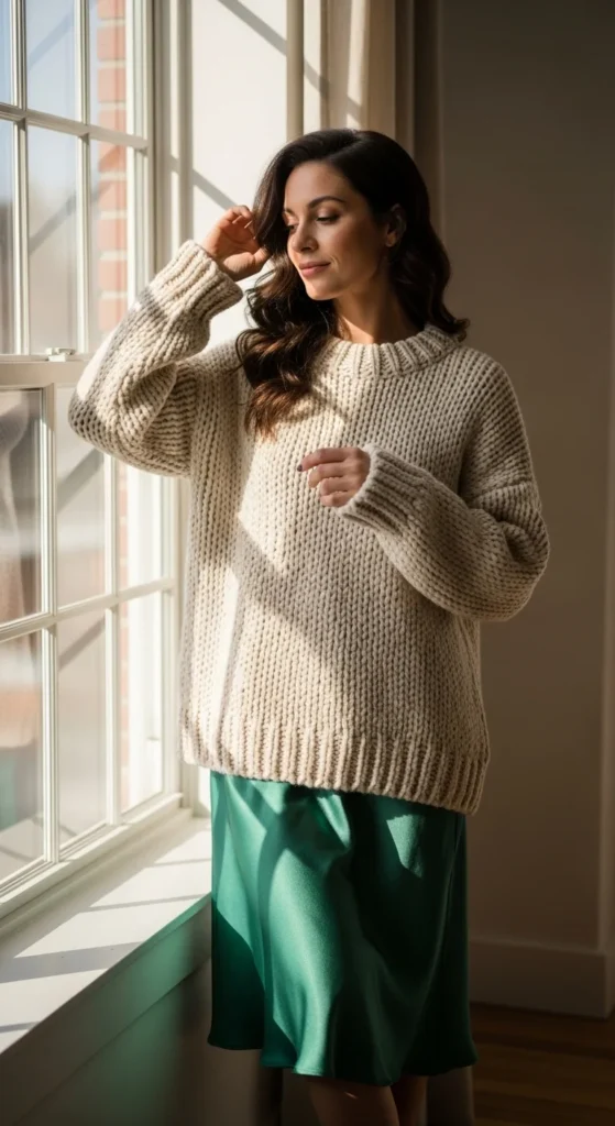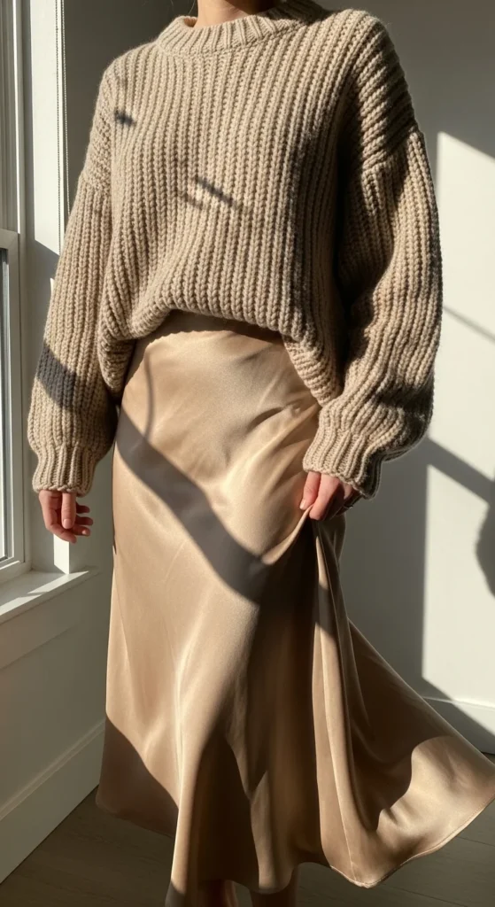 Pairing chunky knits with satin adds contrast that feels chic but still laid-back. Look for a satin skirt you already have—any midi length works. A beige knit softens the sheen, giving the outfit a warm, balanced feel. Keep the sweater slightly loose to avoid a stiff look. Tuck only one side if you want an effortless shape. Add ankle boots for cooler days, or wear slip-ons if you’re staying indoors. For a budget-friendly option, choose a thrifted satin piece or one you already own from previous seasons. If the skirt wrinkles, hang it in a steamy bathroom for a quick fix. A simple necklace works well because satin already brings shine. Keep your bag neutral so the outfit stays harmonious. This pairing works for casual afternoons, lunches, or low-key gatherings.