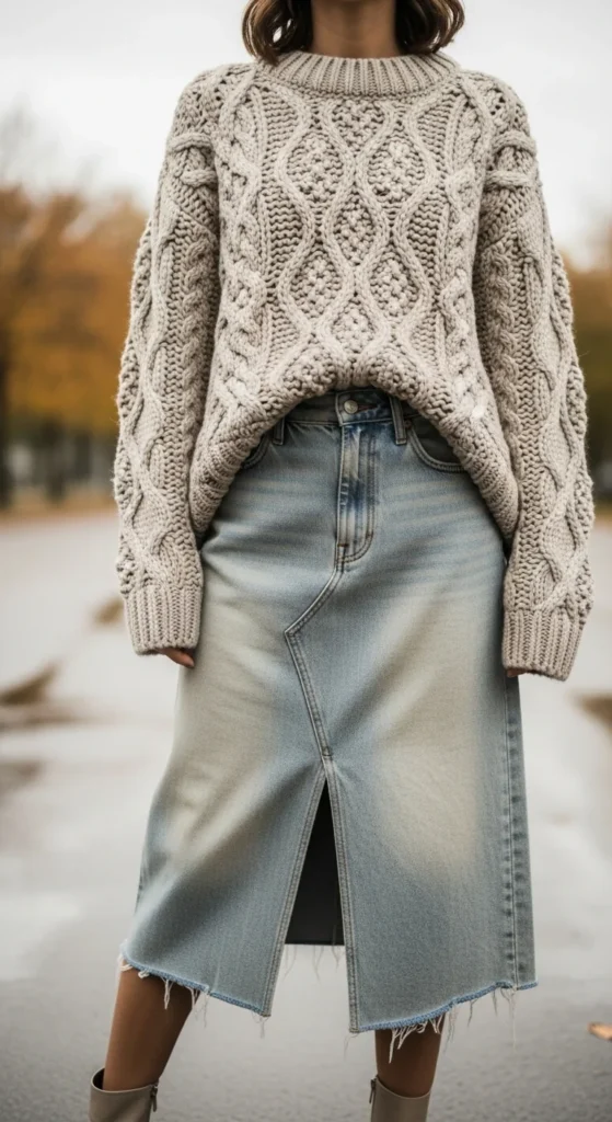 7. Chunky-Knit Sweater With Midi Denim Skirt