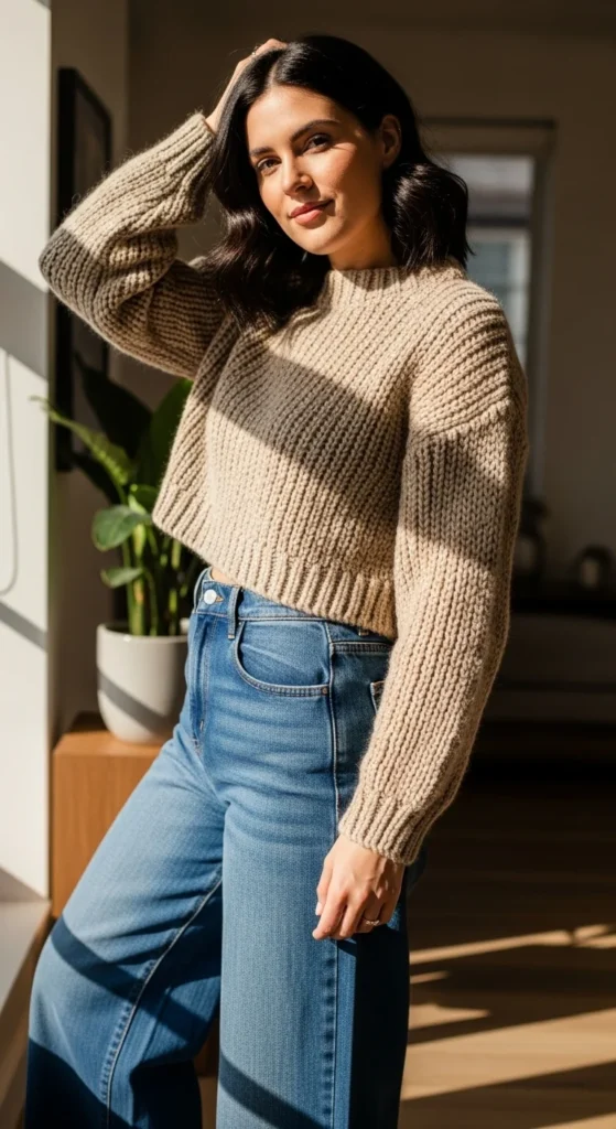 A cropped chunky knit works well with high-waisted bottoms because the proportions look balanced. Pick pants you already have in black, beige, or olive. This pairing shows your waist without feeling exposed. Add sneakers or heeled boots depending on your day. A belt adds structure if the pants feel loose. For extra warmth, layer a long coat. Avoid heavy accessories because the sweater already has impact. You can DIY a cropped effect by tucking a regular sweater under your bra band—a common fashion hack that avoids cutting the fabric. Keep your makeup and hair simple to match the relaxed vibe. This outfit works for coffee runs, casual dinners, or weekend plans.