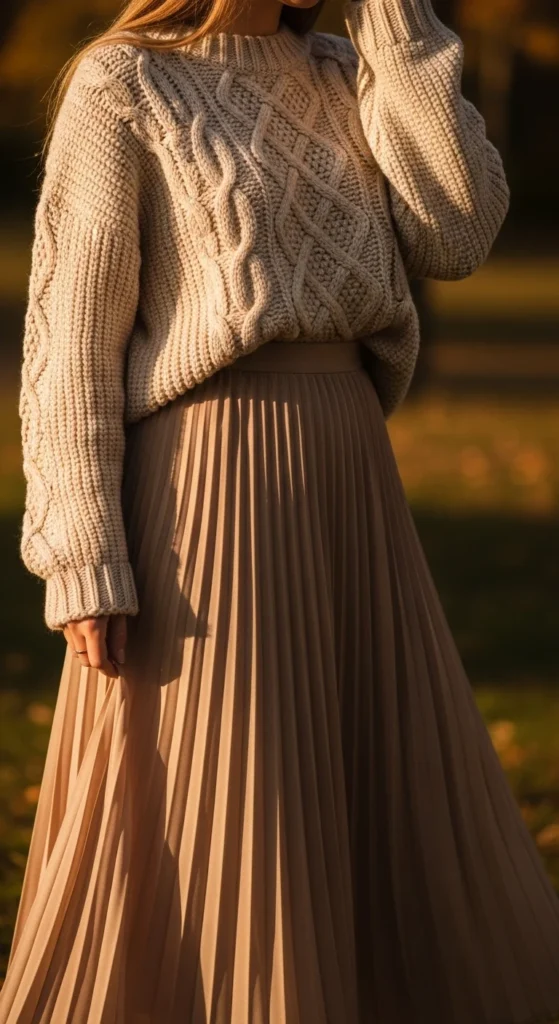 Pleated skirts create a soft shape that looks good with chunky sweaters. Choose any length—midi flows best. Pick a sweater in a complementary shade, like cream with blush or gray with navy. Keep the sweater loose but not overwhelming. Add flats or low heels to maintain balance. This outfit works well for low-key outings or office-casual days. If your skirt wrinkles easily, hang it after wear so it keeps its folds. A simple bag keeps the outfit clean. DIY tip: use a small safety pin inside the waistband to gather extra fabric if the skirt feels too wide. A thin necklace adds soft detail without competing with the textures.