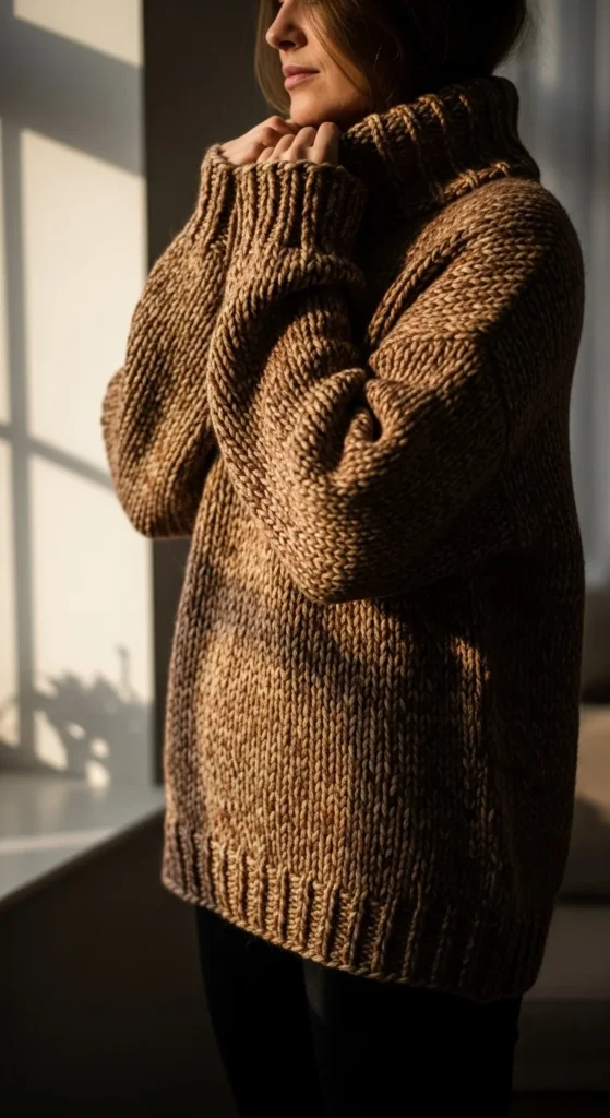 A chunky turtleneck adds height and presence to wide-leg trousers. Pick trousers you already own, especially neutral colors like tan, charcoal, or black. Do a soft tuck in the front to define your waist. This keeps the volume from overwhelming the outfit. Add loafers for a smooth finish, or wear heeled boots if you want more length in your silhouette. A simple bag, like a structured tote, balances the relaxed top. To keep the sweater from feeling too warm, wear a tank under it instead of a long-sleeve. If your sweater pills, use a small fabric shaver to clean it and make it look new. A thin belt can add shape without changing the outfit’s cozy vibe. When temperatures drop, layer a wool coat over everything to stay warm while keeping the look sleek.