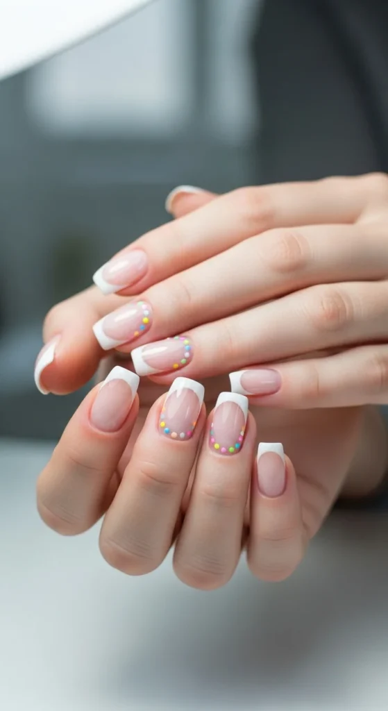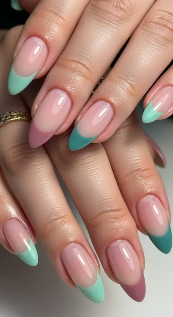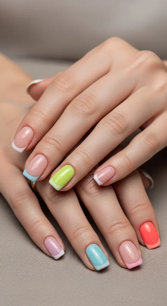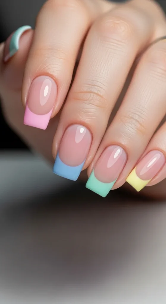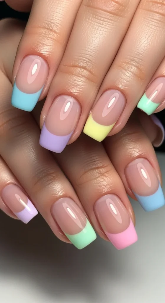 Pastel rainbow tips are cheerful without being loud. Each nail gets a different soft shade. Think lavender, mint, baby blue, pale yellow, and blush. The key is keeping the tip thin so the colors feel balanced.