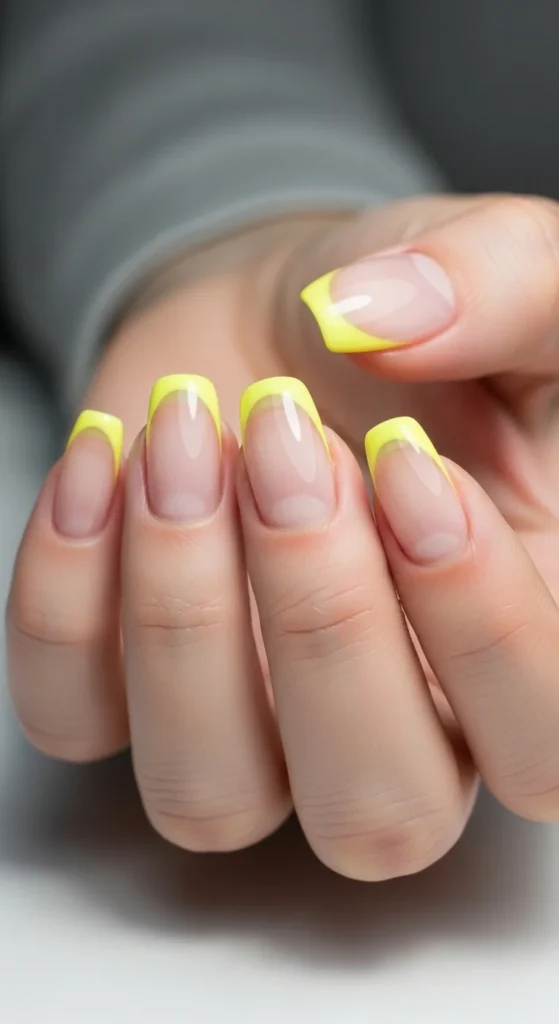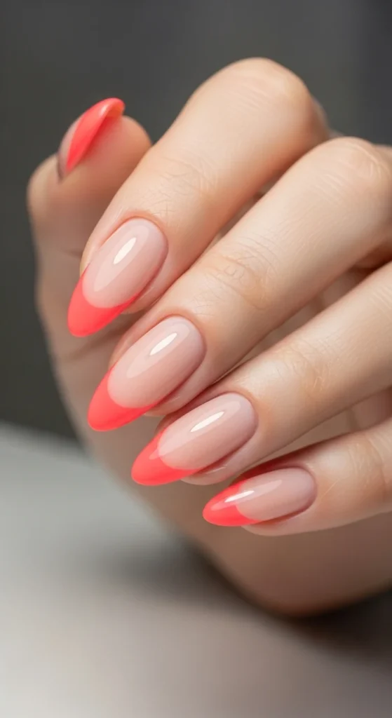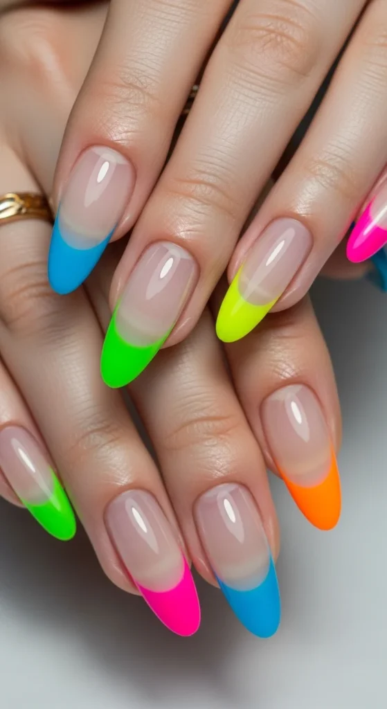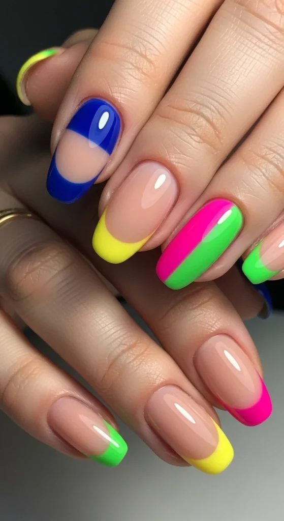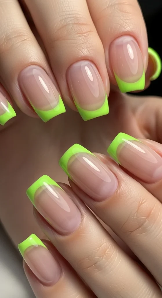 Neon tips bring energy in a controlled way. The trick is keeping the line slim. A thin edge of neon pink, green, or orange looks playful but still clean.