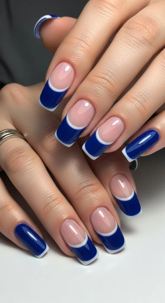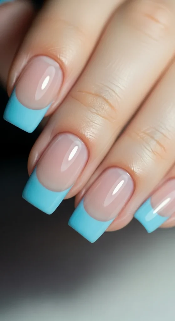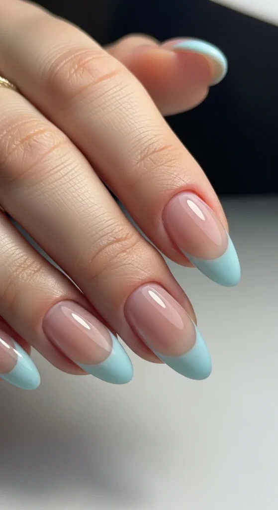 Soft blue tips feel calm and polished. Powder blue or sky blue works best. Keep the base sheer pink or nude.