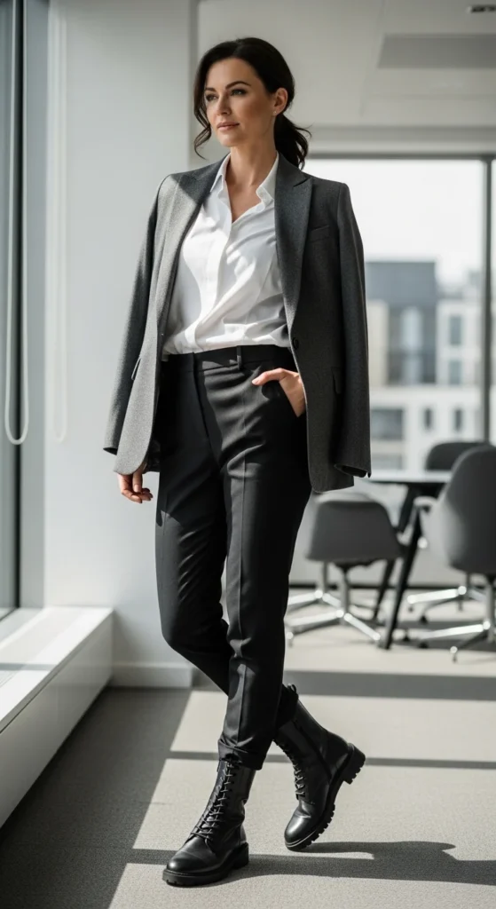 Yes—you can absolutely wear combat boots to work. The key is pairing them with structured pieces.