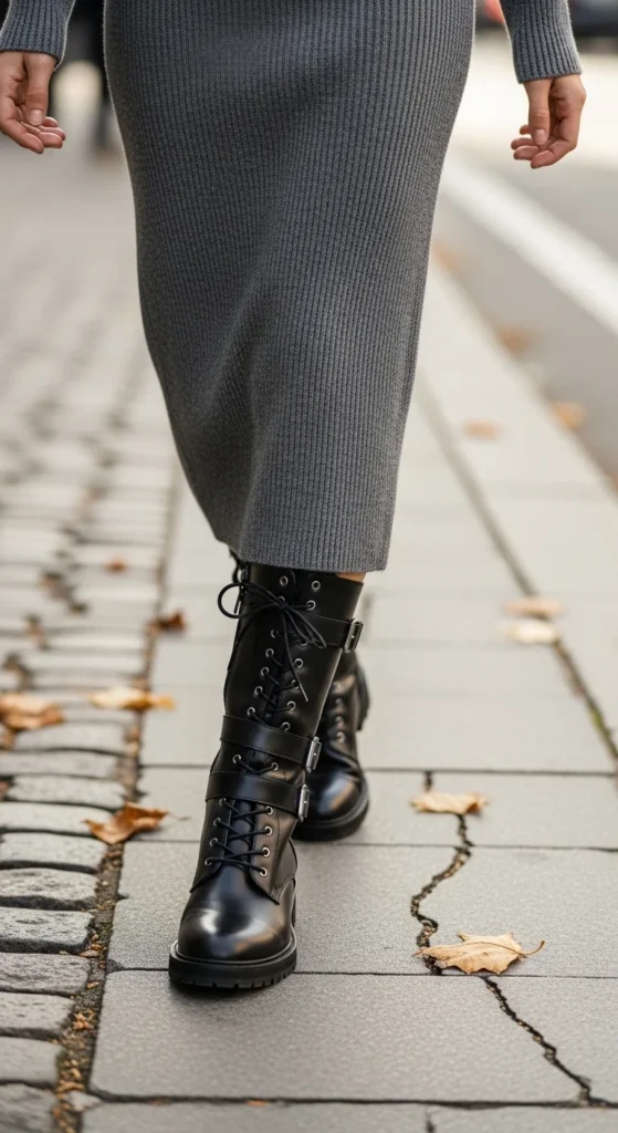 This is where many outfits go wrong. Combat boots already add visual weight, so the rest of the outfit should feel intentional.