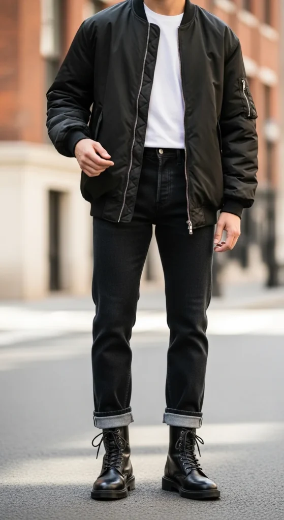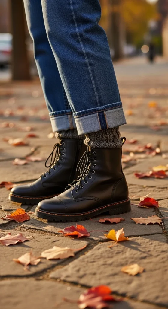 If you want boots to show without tucking, cuffing is your best friend. Straight-leg denim looks especially good with combat boots because it keeps proportions balanced.