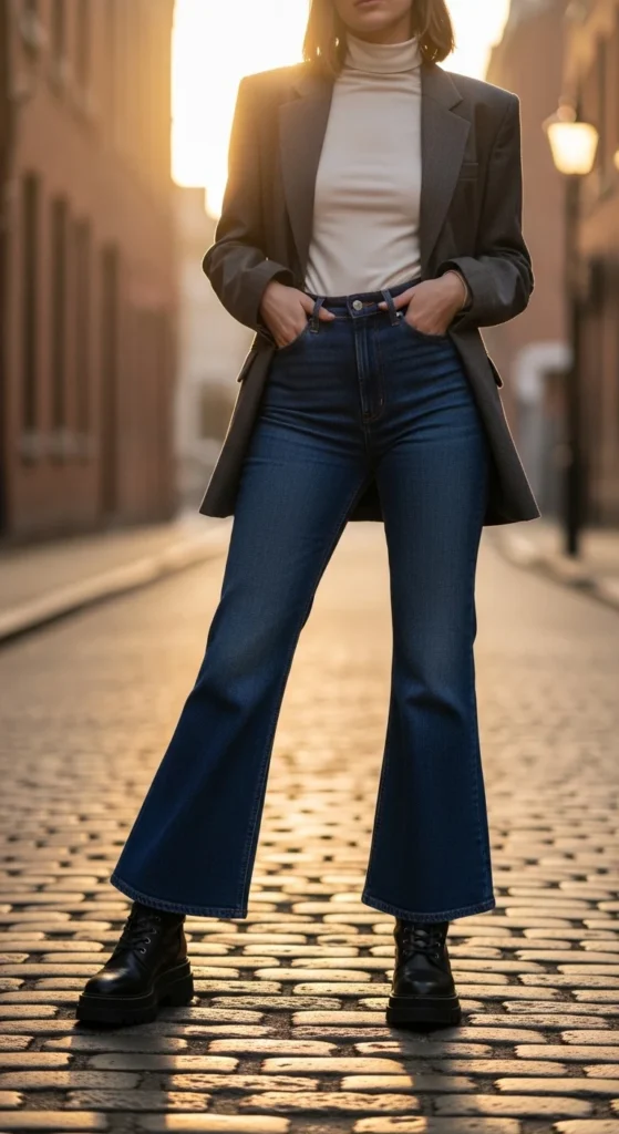 Flared jeans with combat boots give that cool retro vibe—especially when the boot sole peeks out as you walk. It’s a little 70s, a little street, and surprisingly flattering.