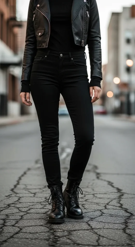 Slim jeans and combat boots are a no-fail pairing because the silhouette stays streamlined. The boots get to be the statement, and your leg line looks clean.