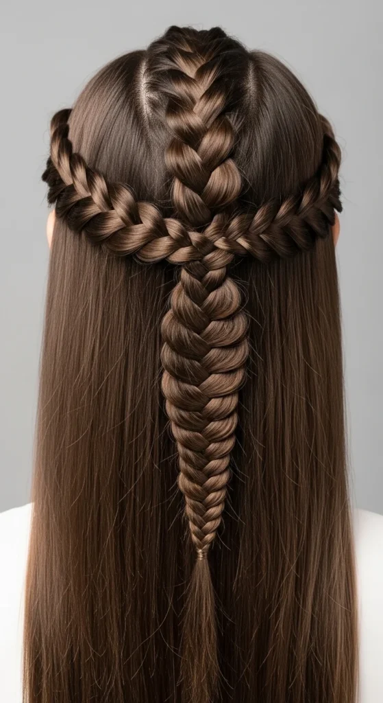 This combo looks detailed without extra tools. Start with a Dutch braid from the crown to the nape. Then split the tail into two and fishtail the rest.