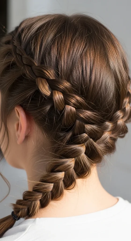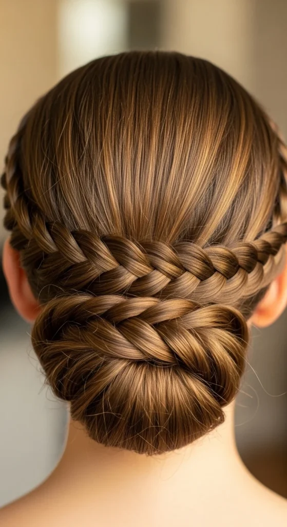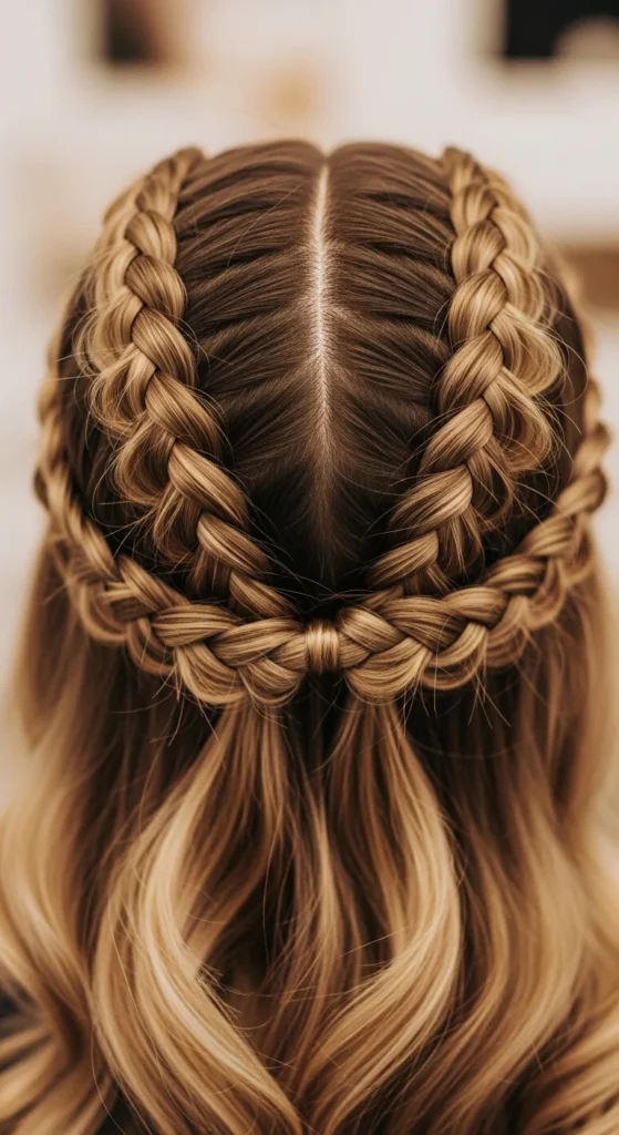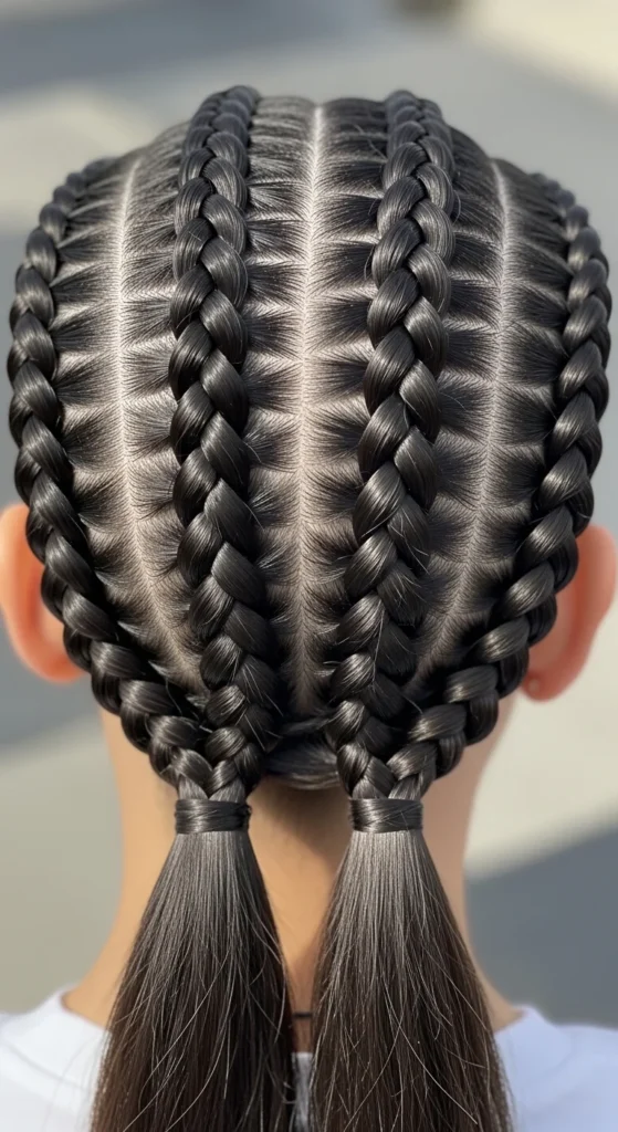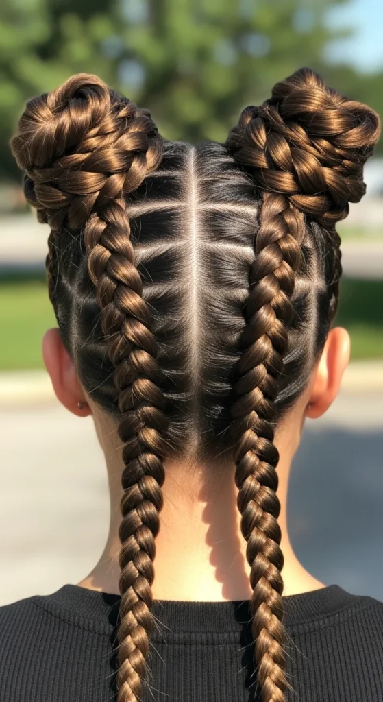 Tie off each braid. You can leave them down or wrap them into two buns. For softness, widen the braids slightly. For a neat look, keep tension firm.