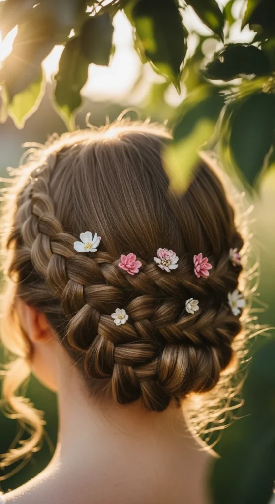 A few flower pins can change the whole look. Do a side or crown Dutch braid. Then tuck small flowers or pins into the braid edges.