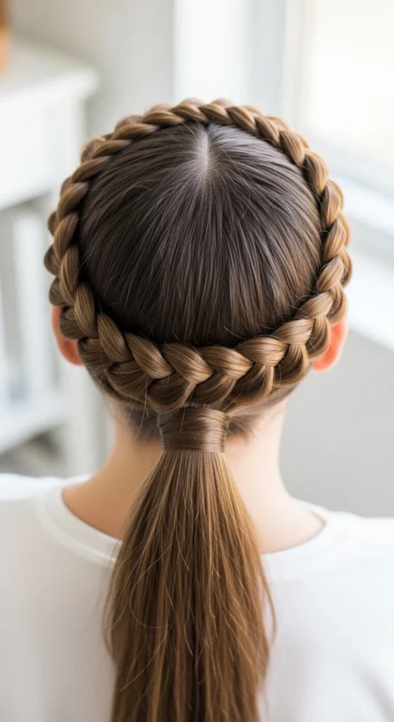 Budget tip: If you can’t braid in a full circle, do two side Dutch braids and pin them into a crown shape, then tie the ponytail.