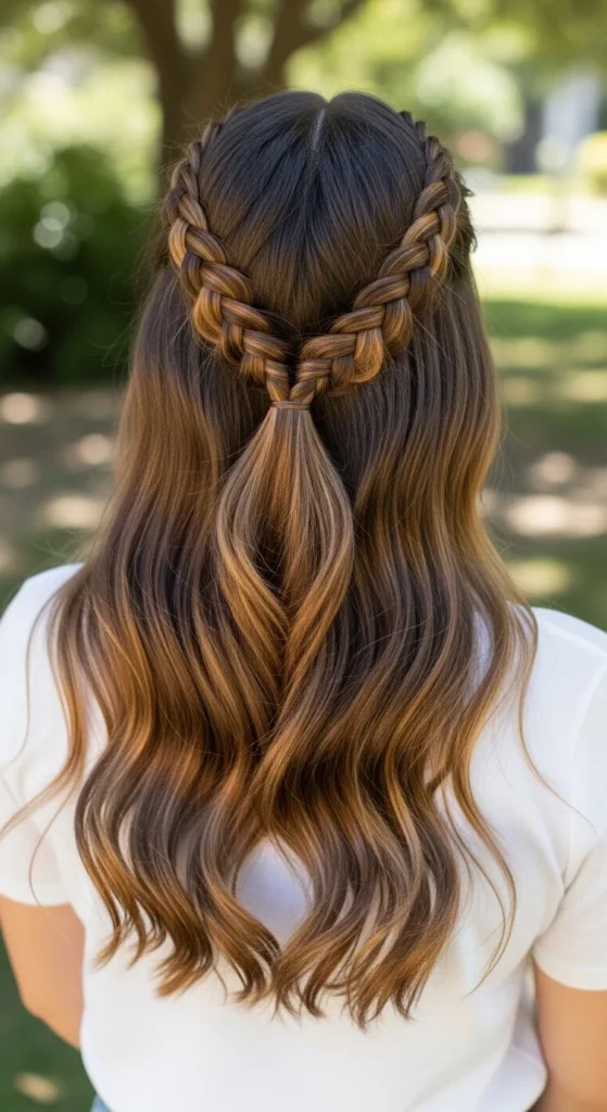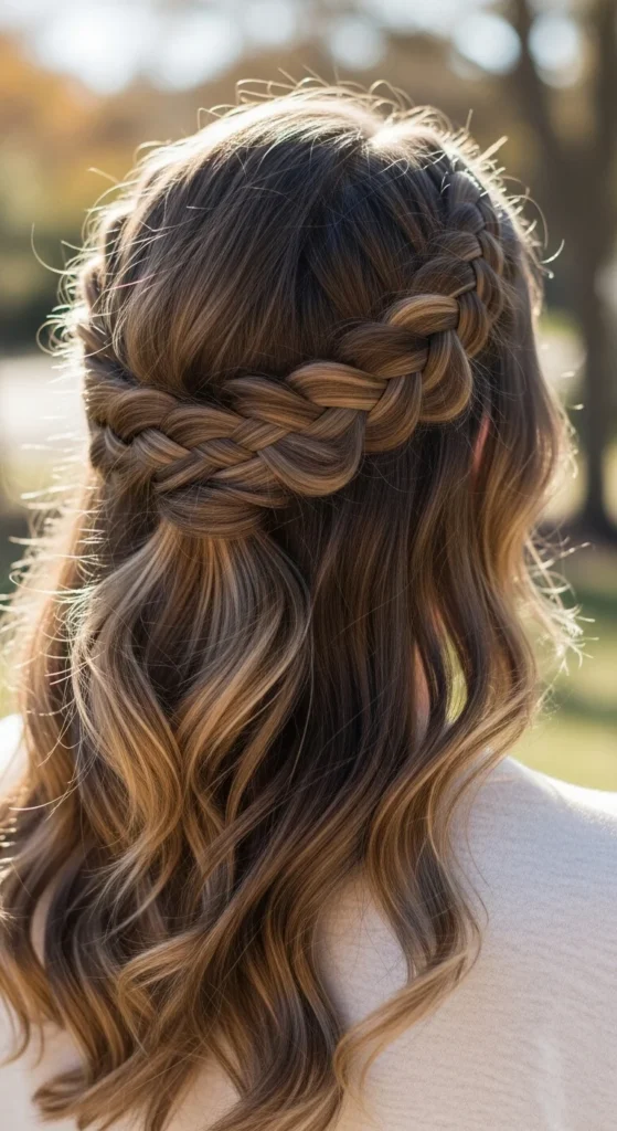 Budget tip: Heat-free waves are easy. Braid the loose hair in one big braid for 30–60 minutes, undo it, then do the half-up braid.