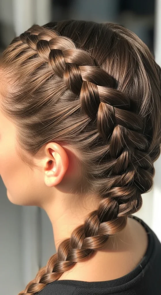 This braid looks fancy but the steps are simple. Start near one temple and braid diagonally across the back of the head. When you reach the opposite nape area, tie off and finish as a braid or bun.