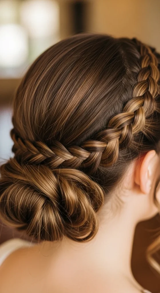 Start a Dutch braid on one side and braid toward the opposite nape. Tie off and wrap the tail into a low side bun. Pin securely.
