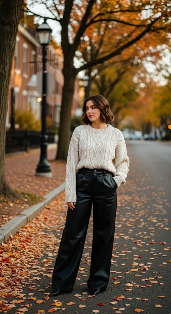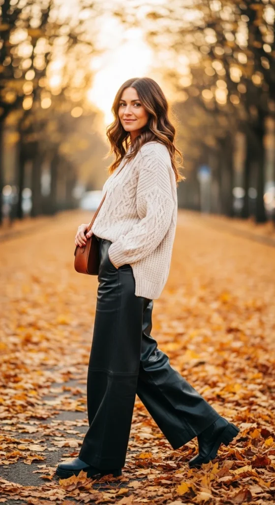 Leather pants naturally lean edgy and structured. Fall styling works best when you soften the look with warm textures.