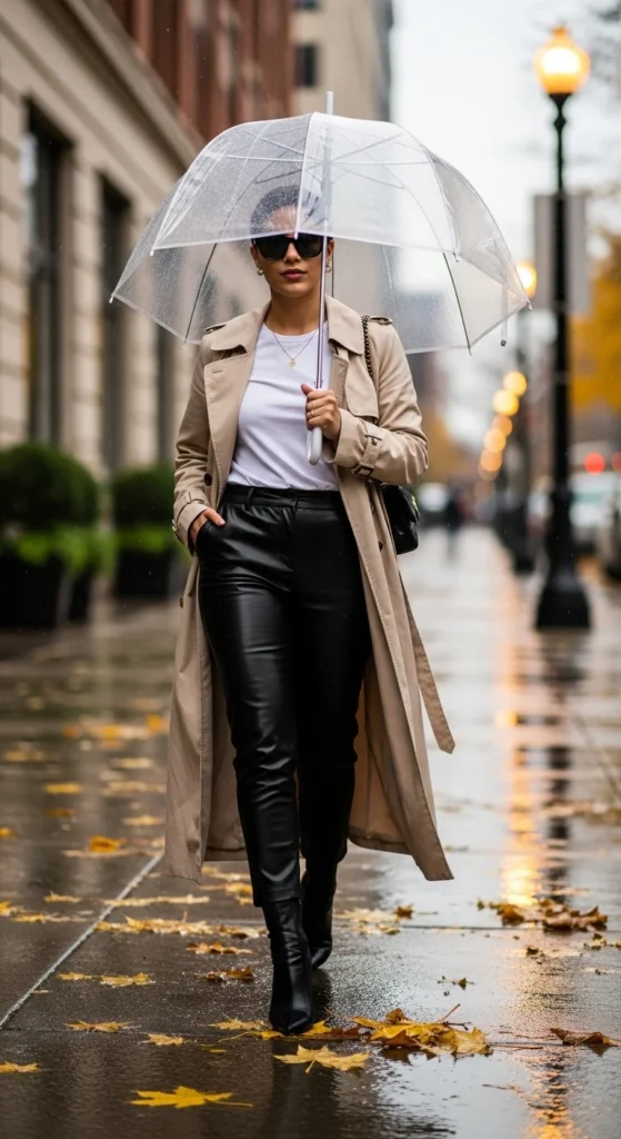 Look 3: Trench Coat + Leather Pants (Weatherproof Chic)