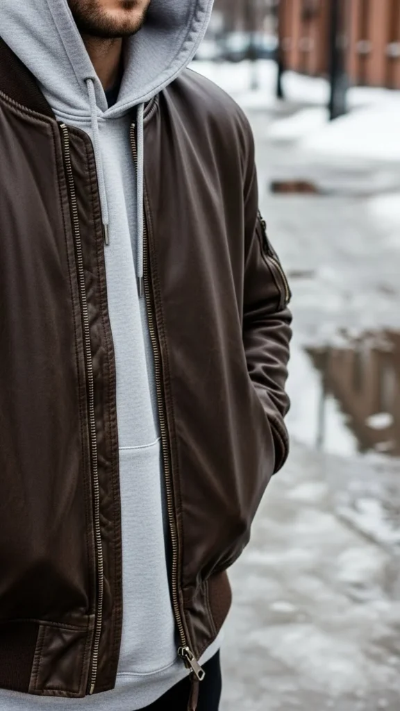 Bomber jackets feel warm and compact. Pair with slim jeans or joggers. Add sturdy boots. This outfit works for busy days or outdoor activities. If the jacket feels short, choose a longer hoodie for layered depth. Bombers are affordable and easy to style in winter.